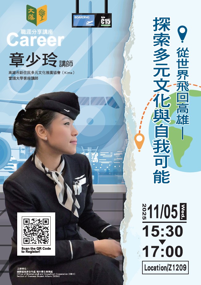 章老師將以自身的國際視野與跨文化經驗,帶領同學們思考如何在未來職場中培養國際溝通力、文化敏感度與自我定位,啟發大家在多元世界中找到屬於自己的方向與可能。