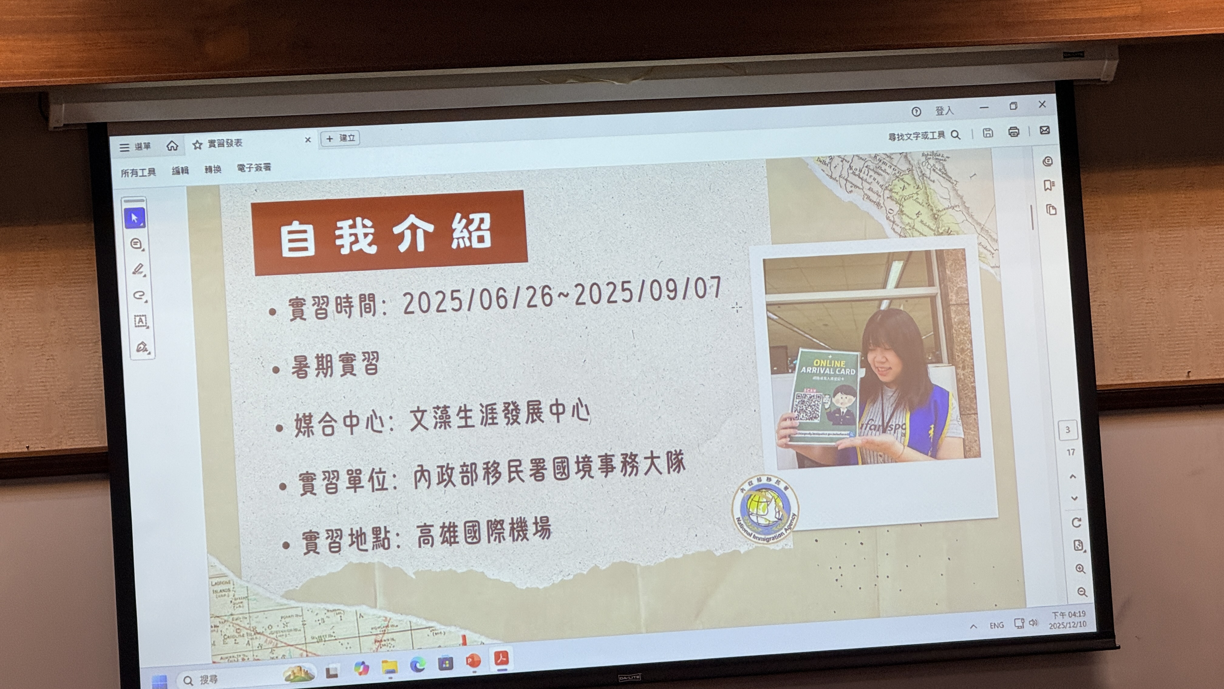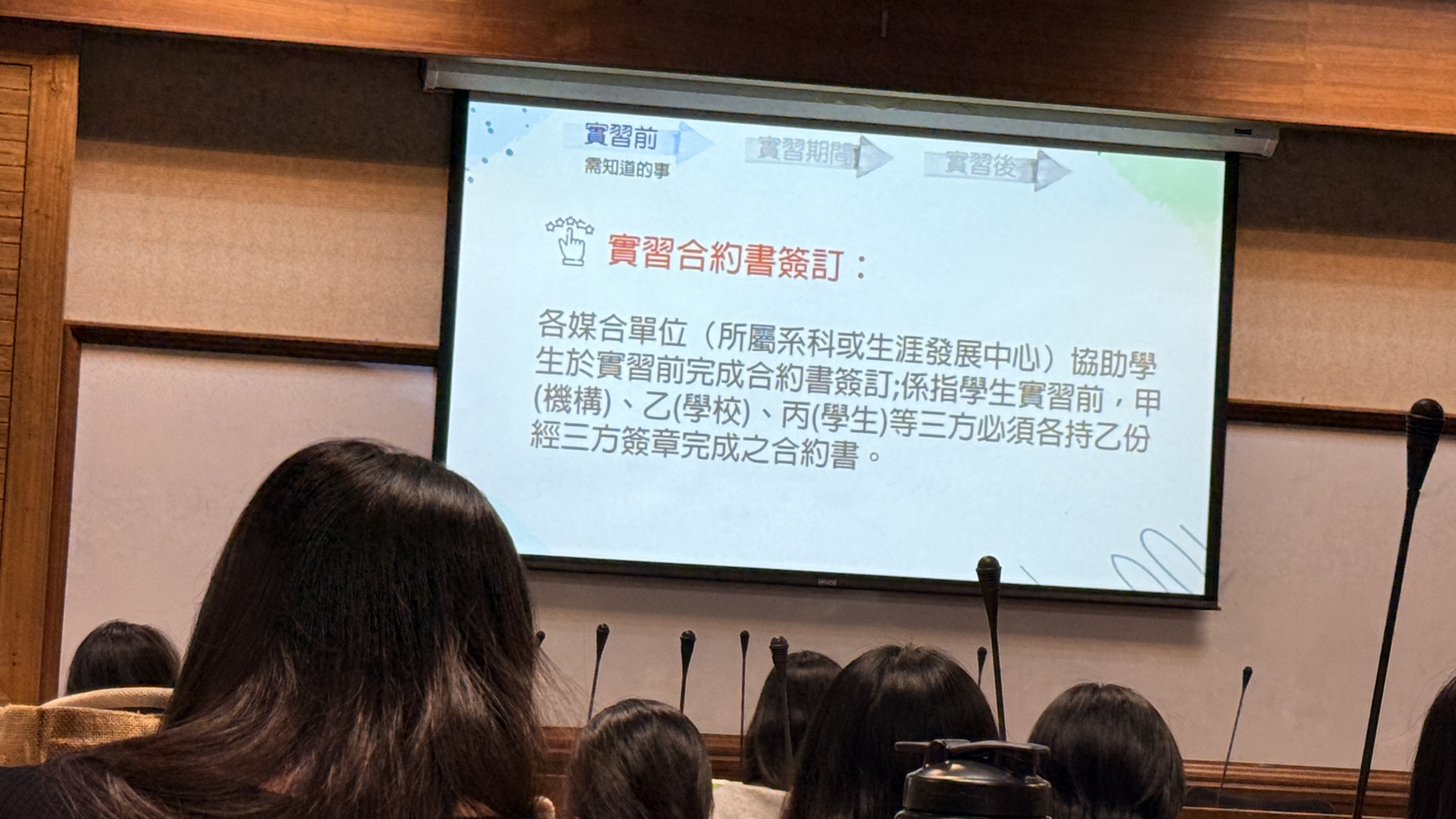 在學生開始實習前,特別舉辦實習行前說明會,提供學生實習職場應注意的相關安全職場問題及如何順利完成實習的注意事項,讓學生們在實習的過程中順利完成實習,並從實習中得到在學校無法學習到的經驗。