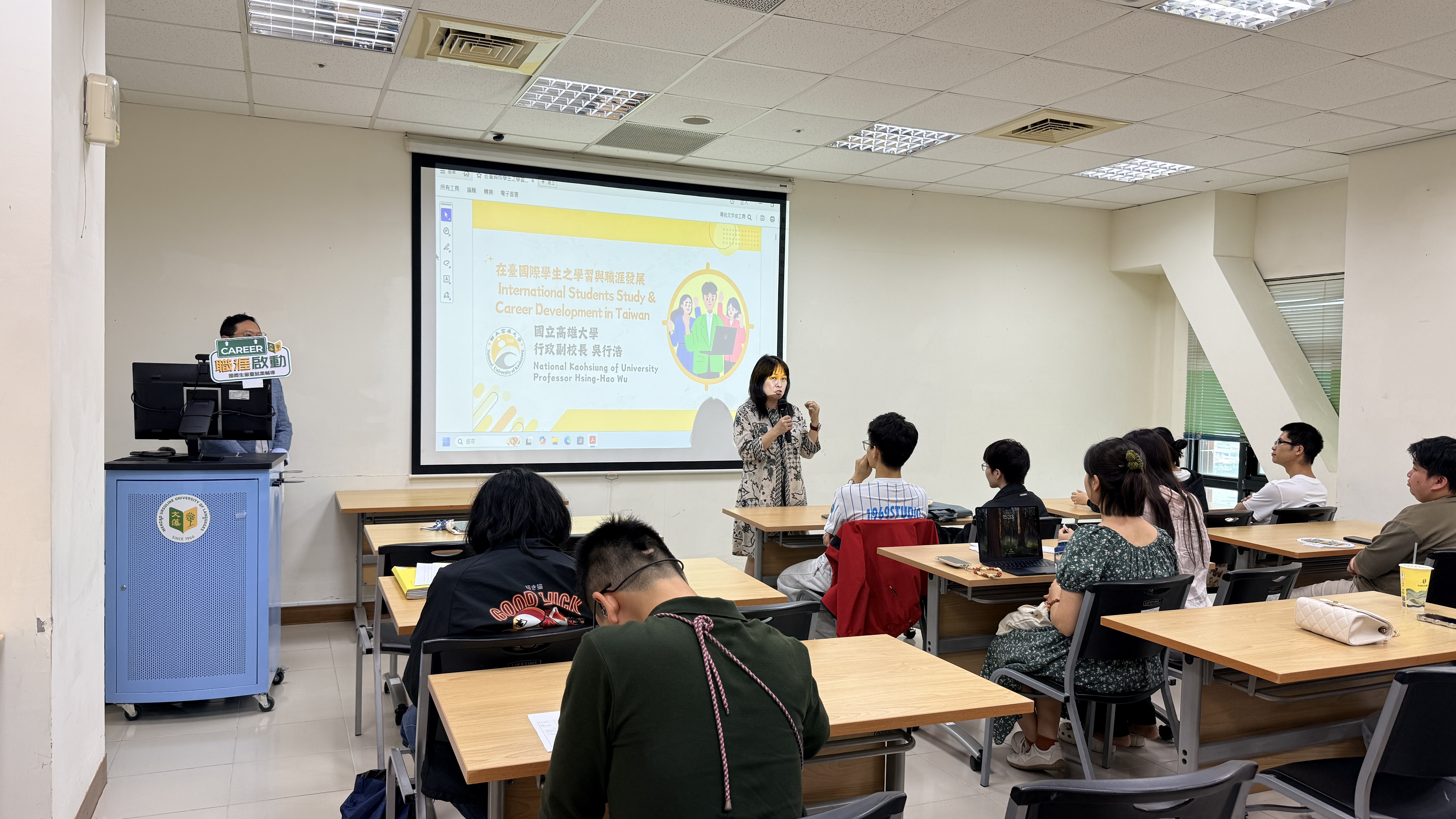 講座內容涵蓋國際生留臺就業相關法規、評點制制度及申請條件,並從在臺國際生角度出發,說明職涯發展規劃方向與實務建議。