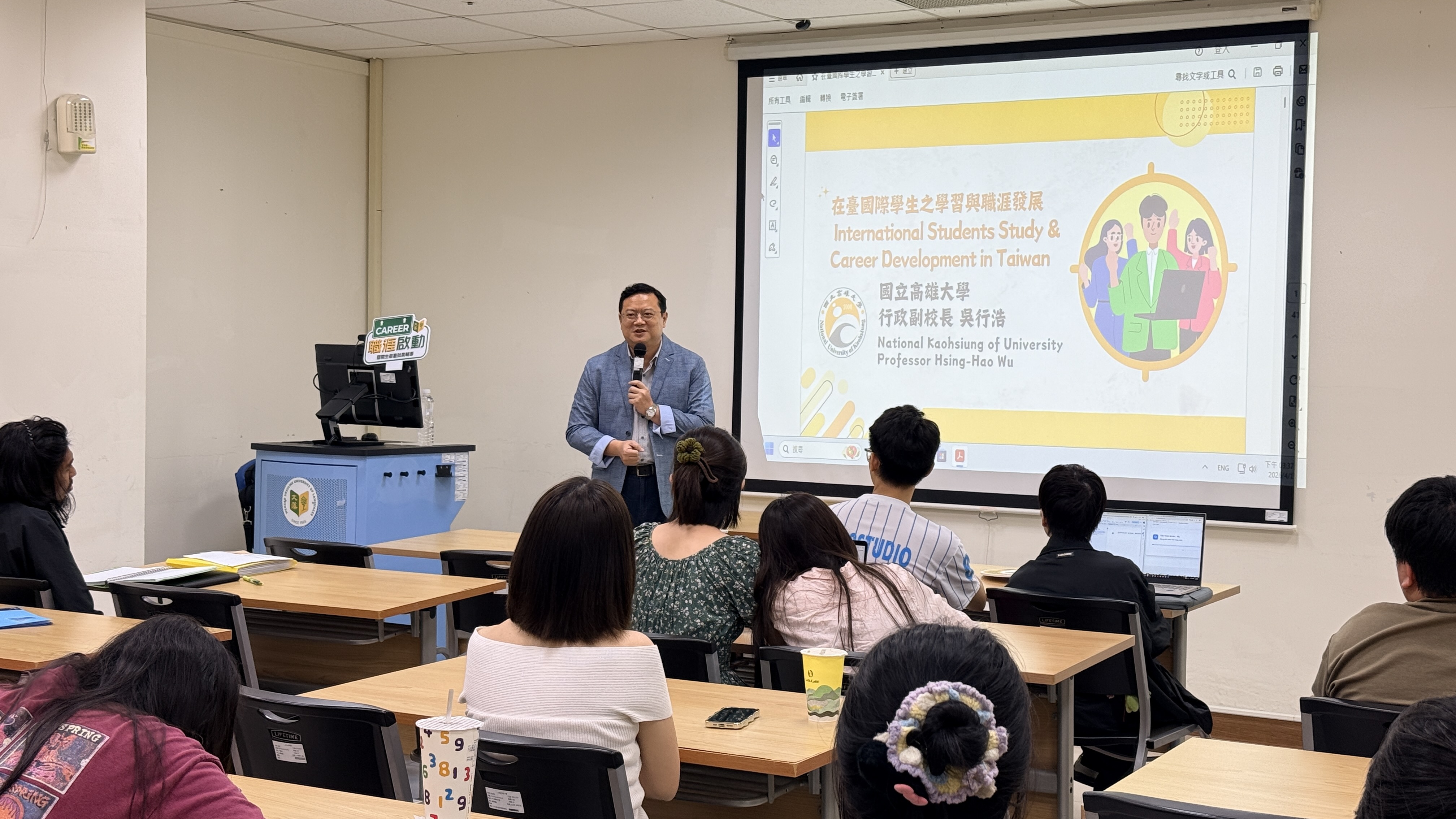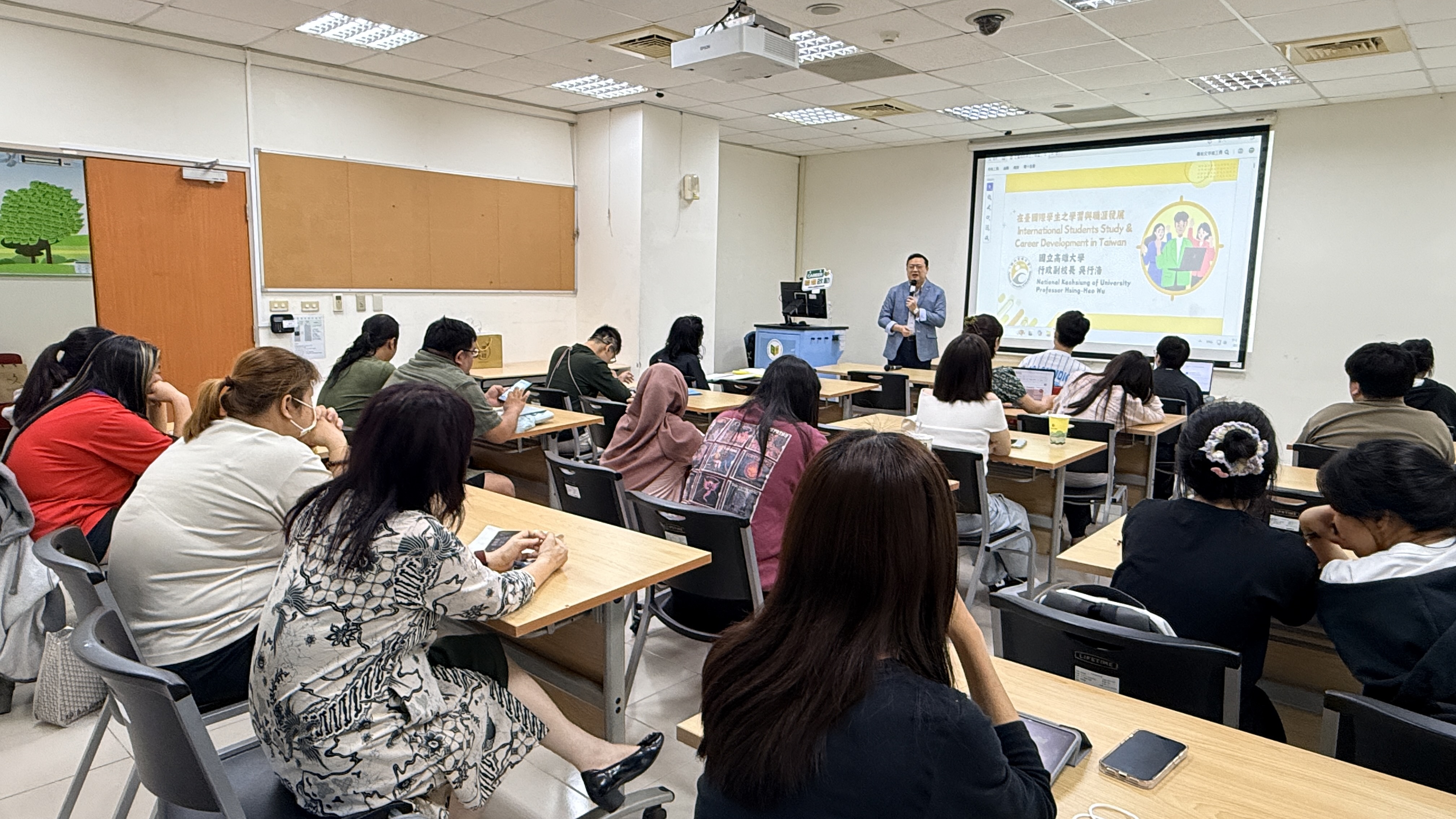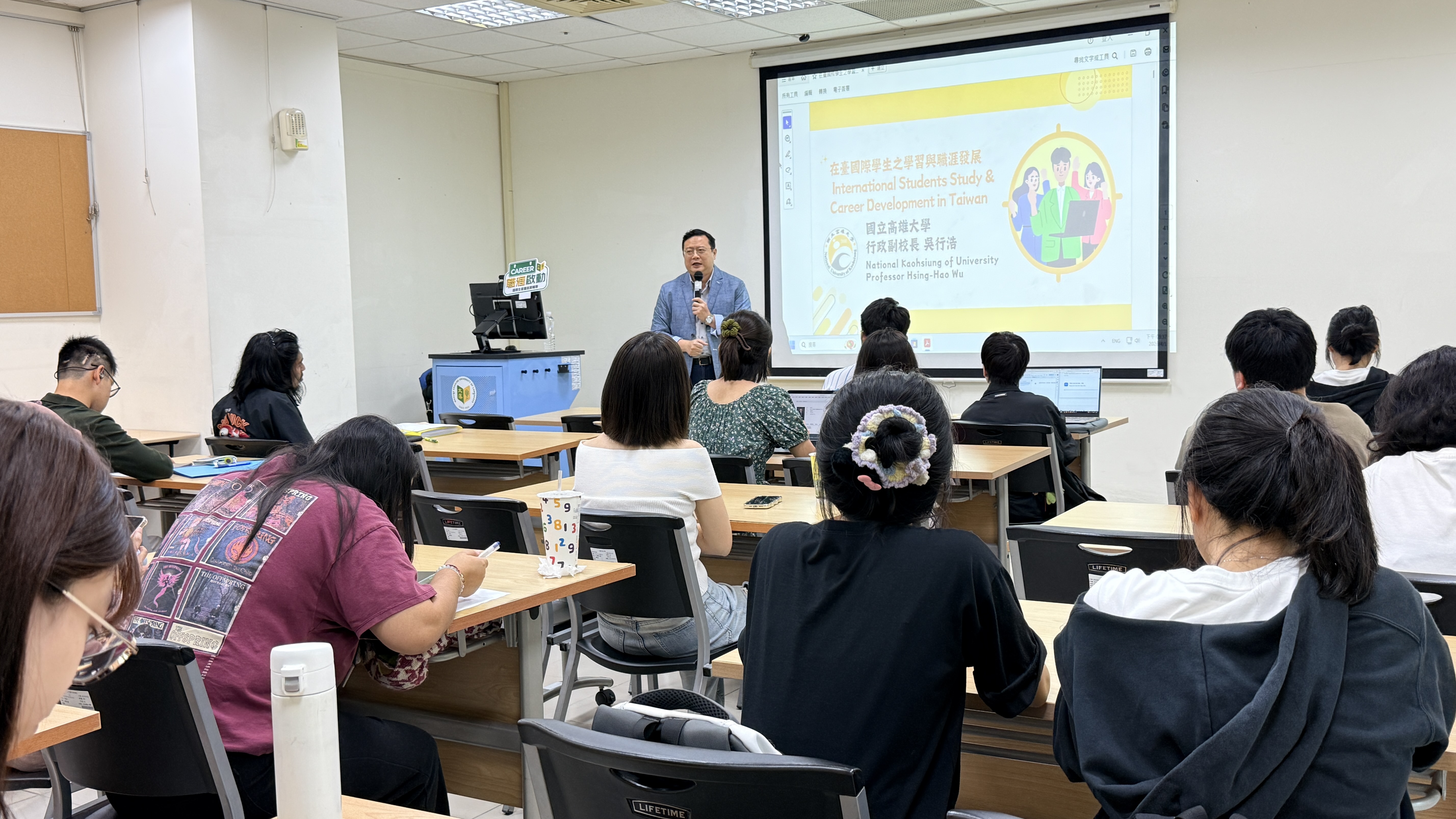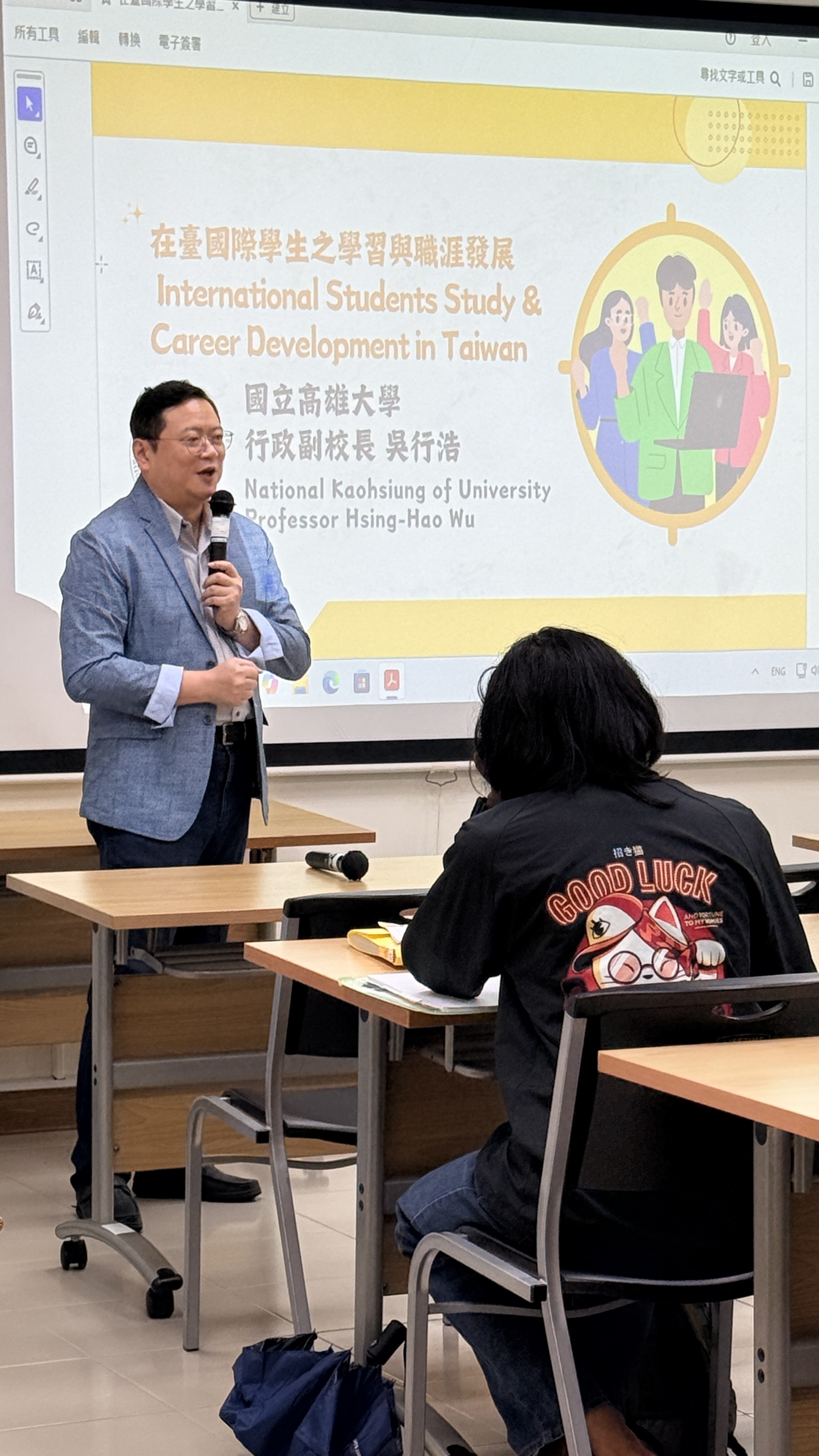 本次「留臺就業法規與職涯發展講座」,邀請 吳行浩 副校長擔任講者,針對國際學生在臺學習與畢業後留臺發展議題進行專題分享。